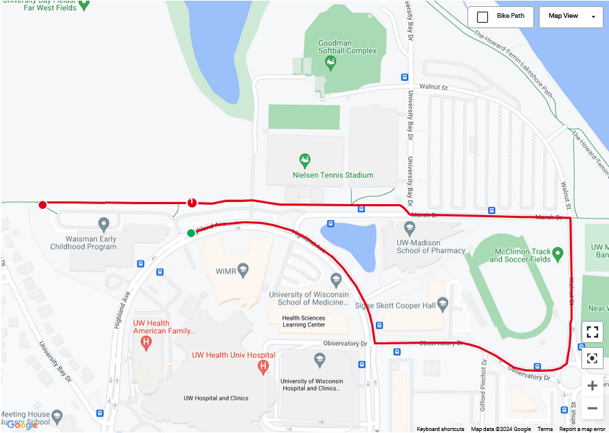 Directions: Turn North from University Avenue at the intersection of University Bay Drive and Farley Avenue; continue over the hill onto Highland Avenue. The Waisman Center is down the hill on the left. Enter parking lot by athletic fields. Click here for driving directions, map, and parking